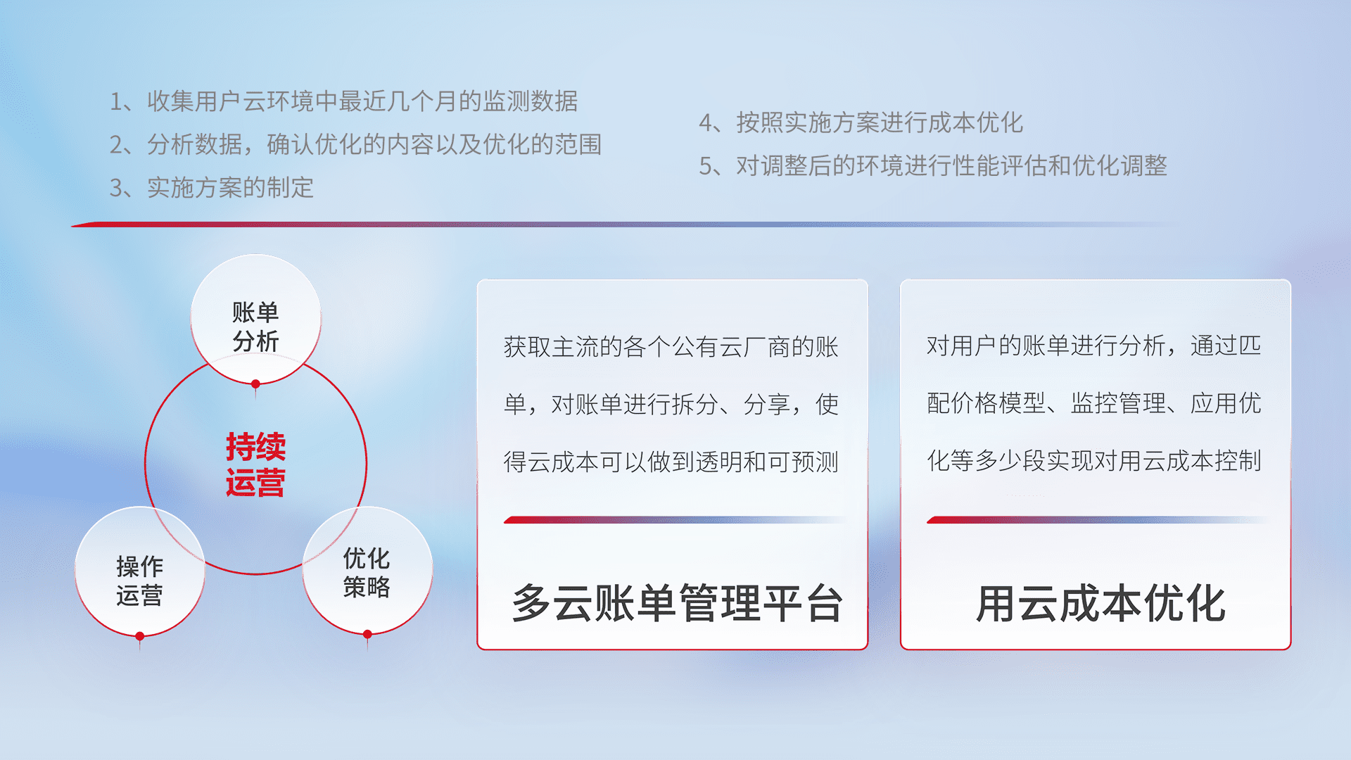 通过多云纳管,,,以统一的资源数据模型把客户的云资源进行抽象和封装,,进而实现对多云资源的统一操作,,,,保障云资源管理的可靠性、、、、稳定性与可用性。。量身定制化运维内容,,配置、、开发运维、、、、补丁管理、、、、备份、、监控、、、、认证和访问管理、、、、审计和日常巡检等,,,,保障在用云过程中的可靠度,,稳定度以及高可用率。。。。